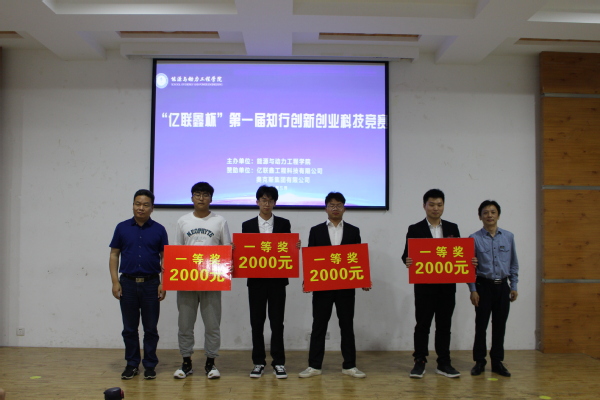 “亿联鑫杯”第一届知行创新创业科技竞赛是能源与动力工程学院为深入学习习近平新时代中国特色社会主义思想,学习贯彻党的十九大历届全会精神,进一步引导广大学生努力培养科学精神和科学态度,积极学习科学知识和科学方法,踊跃投身创新驱动发展战略,以优异成绩庆祝建党100周年,筹备的创新创业科技竞赛。大赛奖金来源于校友亿联鑫工程科技有限公司董事长车福亮先生捐赠和奥克斯集团在能源与动力工程学院设置的创新创业基金。