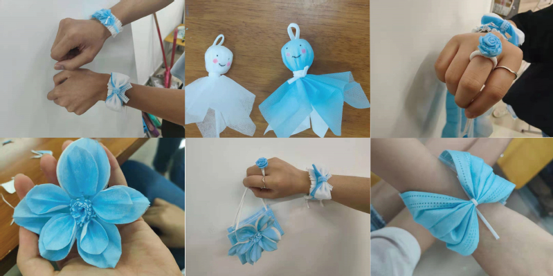 经过商讨选出口罩这个具有疫情期间最具代表性的元素作为本次活动的主要材料,之后,心理部成员收集大量废弃口罩,并进行二次消毒,有效节省材料的同时,更为环保事业尽一份力。之后,经由场地选择、布置场地后,活动正式开始。制作过程中同学们充分发挥想象力,有的做成了装饰品,如花朵、动物、甚至是晴天娃娃,也有的将其制作成了生活用品,手提包、手环、收纳用品等,造型多样,灵巧非凡,而同学们也从开始的迷茫中逐渐沉静下来,看着一个个成品在同学们手上悄然成型,无不表达了同学们面临疫情常态化情况下,不惧病毒,坚定战胜疫情的决心和对美好生活的向往与期待。在活动的尾声,同学们纷纷展示出制作成果,进行了拍照留念,并将一些优秀作品进行整理保管。