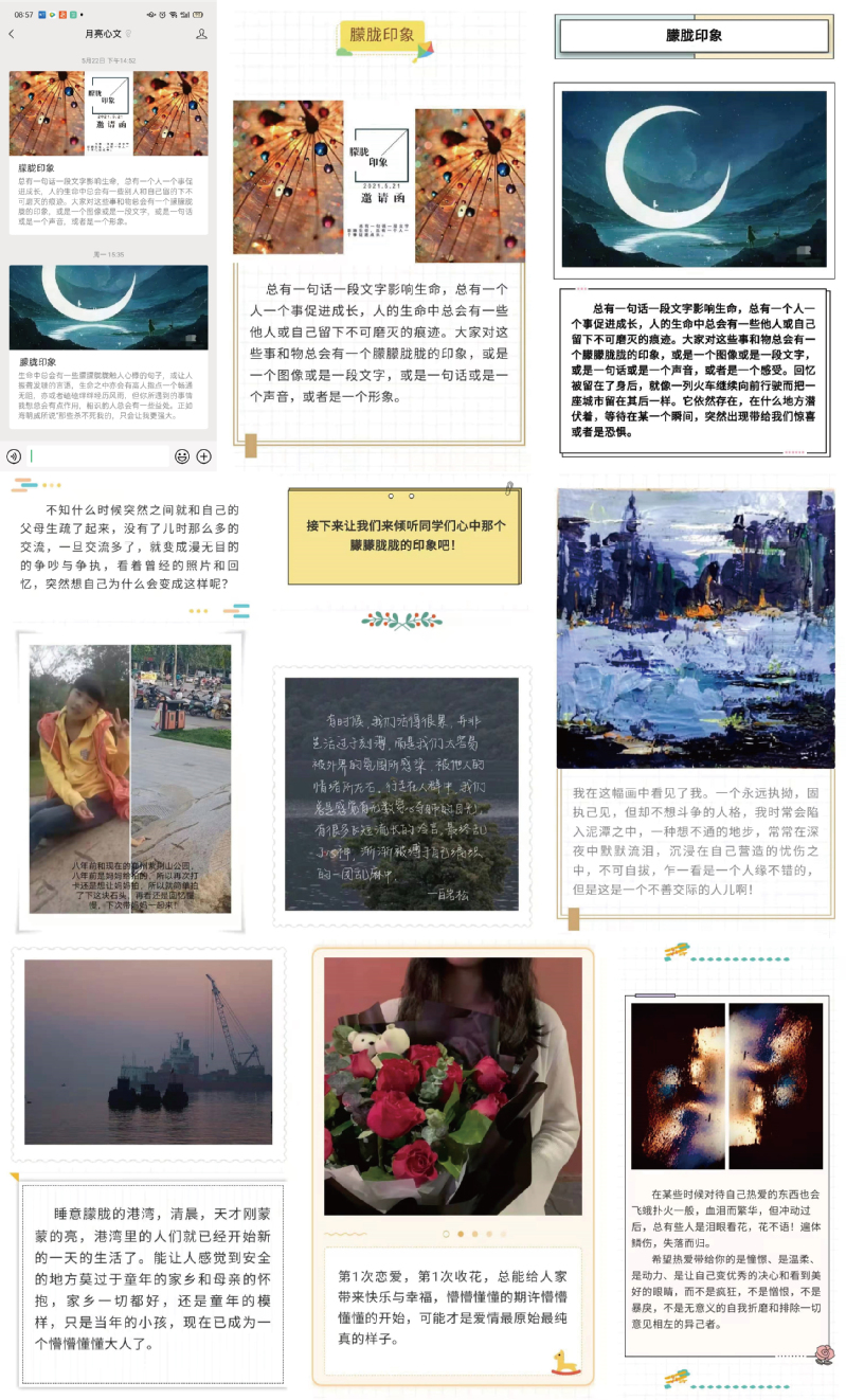 活动开始前,经过心理部进行了公众号推送素材准备,主题选择,内容整理等多项工作。生命中总会有一些触人心悸的瞬间,他们总是一闪而逝,只留给我们一个朦朦胧胧的印象,在某一个瞬间,突然出现带给我们惊喜。一段又一段印象,拼凑成了过往,成为人生路上不断前进的基石。同学们纷纷用不同的方式来表达自己内心中的朦胧印象。活动最后,同学们将自己的感悟,绘画的图片都保存并用公众号推送留念。