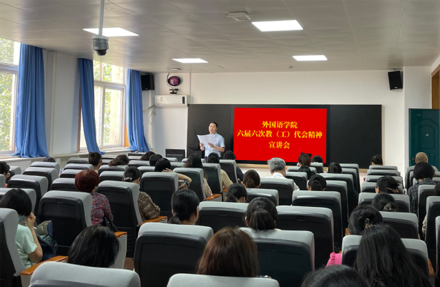 5月27日下午,外国语学院在东二楼209召开全体教职工大会,学习传达学校六届六次教(工)代会精神。会议由学院党委书记王伟主持。