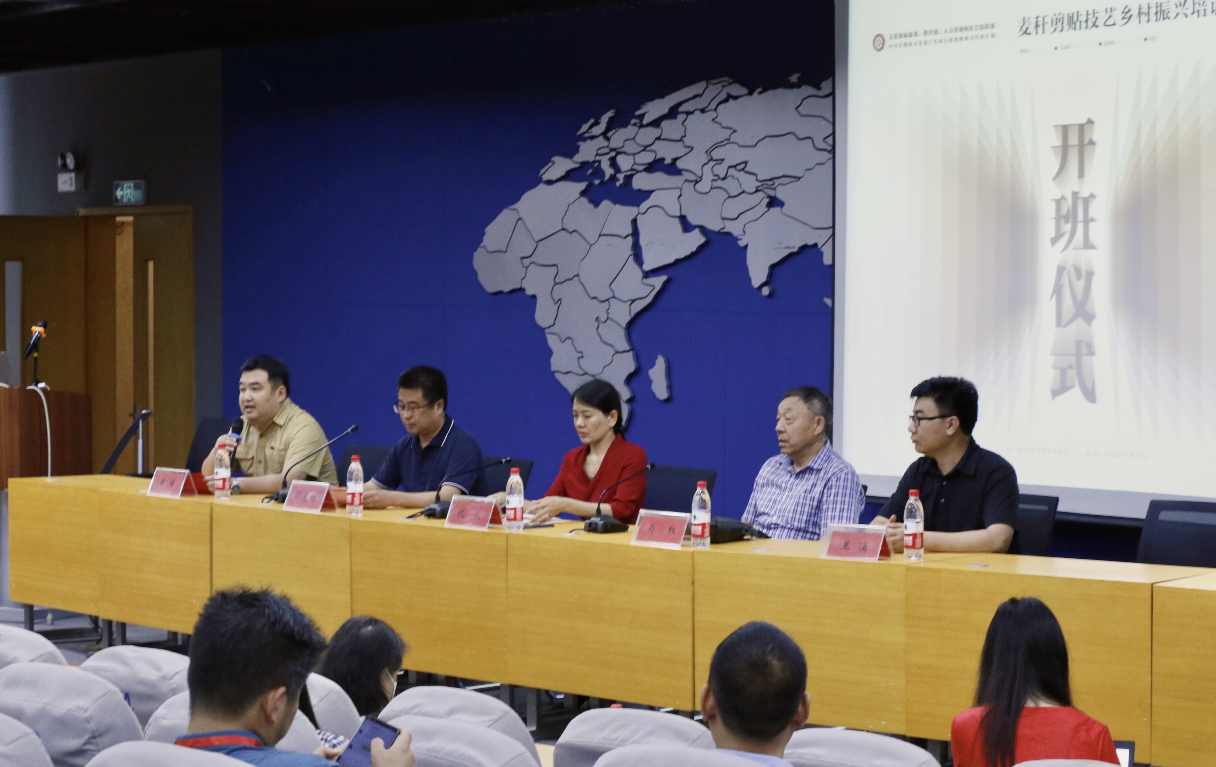 2021年6月16日上午,由河南省文化和旅游厅主办、18新利直播 承办的“2021年度中国非物质文化遗产传承人群研培计划——传统技艺(麦秆剪贴)乡村振兴培训班”在18新利直播 开班。河南省文化和旅游厅非遗处副处长祝欣,18新利直播 艺术设计学院书记邵元珠、副院长薛峰、非遗研究中心办公室主任王潇,外聘专家北方工业大学二级教授肖红,轻大艺术设计学院教师团队出席了开班仪式。