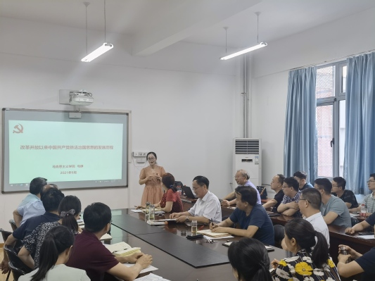 马铮老师做了题为《改革开放以来中国共产党依法治国思想的发展历程》报告。她的报告以时间为轴线,讲述了1978-1997法制创建新时期到1997-2012中国共产党依法治国思想的新阶段党推进依法治国到2012年十八大以来中国共产党依法治国思想新时代的发展历程,介绍了中国特色社会主义法治体系的内容和特点。阐述了我国全面依法治国总体目标和坚持中国特色社会主义法治道路的重要意义。马峥老师通过逻辑严谨的讲解帮助到场人员廓清了“从法制到法治?”、“从法制十六字方针到法治新十六字方针?”、“从以法治国到依法治国到全面依法治国?”等几个重要问题,马铮老师的逻辑严密、讲解幽默,大家听讲认真,现场气氛热烈。
