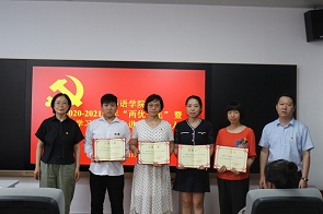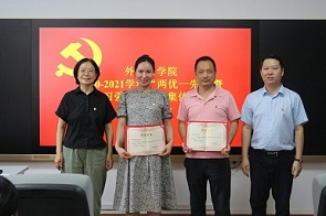 委员会关于表彰2020-2021学年优秀共产党员、优秀党务工作者和先进基层党组织的决定》。外国语学院党委荣获“河南省高等学校先进基层党组织”荣誉称号;大学英语教学部党支部荣获学校“先进党支部”荣誉称号;刘秋瑞、苏珊珊、张衡同志荣获学校“优秀共产党员”荣誉称号;周晓红同志荣获学校“优秀党务工作者”荣誉称号。副院长边铀铀宣读《中共外国语学院委员会关于表彰2021年度“学习强国”学习平台“先进集体”“学习标兵”的决定》,英语系支部、蔡礼鸿同志等分别荣获学院“学习强国”先进集体和先进个人。