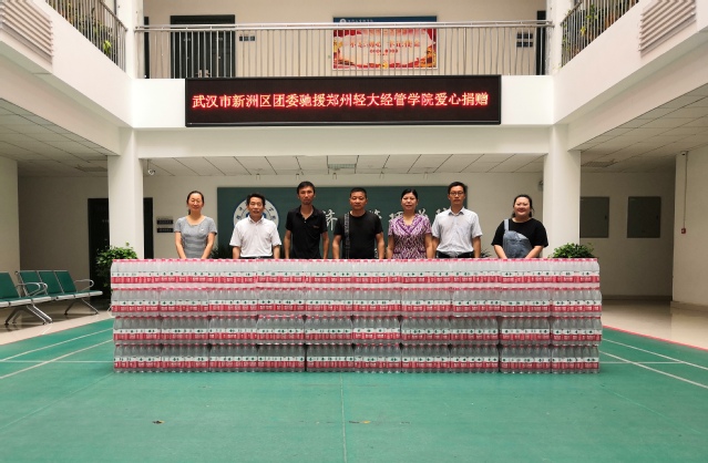 7月24日上午,武汉市新洲区团委向我校经济与管理学院对口捐赠抗洪抢险生活物资(瓶装矿泉水)一批。