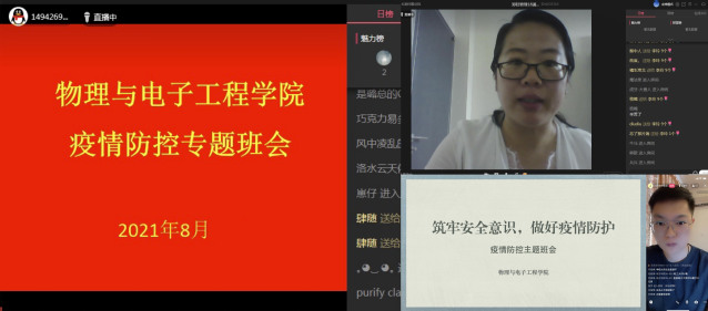近日,物理与电子工程学院结合疫情防控工作相关要求,及时组织全体辅导员通过网络向全体学生召开了疫情防控主题班会。