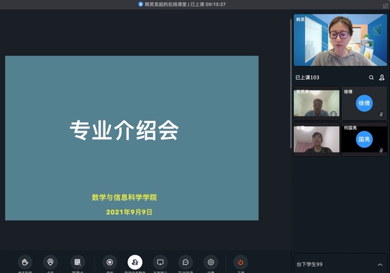 为帮助2021级本科新生更加全面地了解所学专业的基本内容和未来前景,更好地规划自己的学业生涯,尽快熟悉线上教学流程及学籍管理、学分修订等内容,数学与信息科学学院于9月9日晚19:00通过钉钉线上会议召开专业介绍会,各专业教研室教师、教务老师和全体新生参加会议,会议由辅导员韩笑主持。