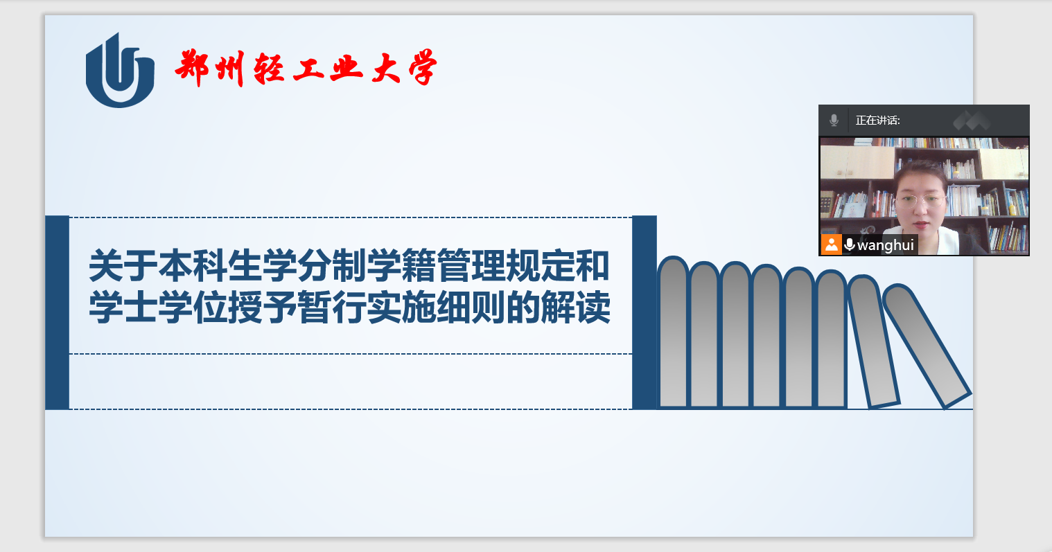 会上,王老师对本科生学分制学籍管理规定和学士学位授予暂行实施细则进行了解读,并对如何使用18新利直播 在线教学平台和注意事项进行了介绍,对进入课程和班级、加入课程方式等方面进行了具体讲解与操作演示,对线上学习、考勤打卡、作业考试、师生互动等线上学习相关环节进行了详细说明,在介绍完相关内容后,对同学们遇到的问题进行了答疑。
