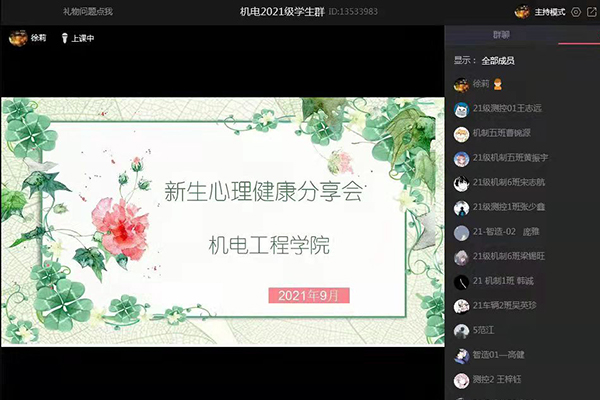 为进一步提升新生对大学新环境的认知及适应能力,帮助新生更快融入大学生活,9月10日上午机电工程学院在线上举办了2021级新生心理健康教育分享会。会议由负责学院心理健康教育工作的专职辅导员徐莉老师主持,2021级全体同学参加了本次会议。