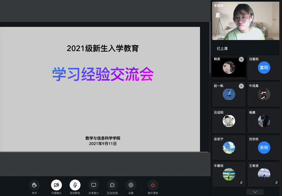 为帮助2021级新生尽快适应大学学习生活,明确学习目标和方向,在大学课程开始前学习优秀的经验与方法,9月11日上午,数学与信息科学学院在钉钉平台召开“学习经验交流会”,2021级辅导员韩笑和学院11名成绩优异的学生代表参加会议。