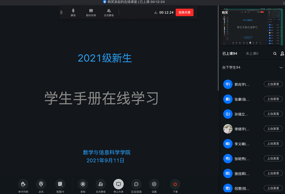 为进一步培养和规范学生行为准则,强化学生遵章守纪意识,提高学生综合素质,凸显人格化、制度化和服务化,确保2021级新生能够尽快融入大学生活。9月11日下午,数学与信息科学学院在钉钉平台召开《学生手册》领学活动,2021级辅导员韩笑主讲,全体2021级新生参与学习。