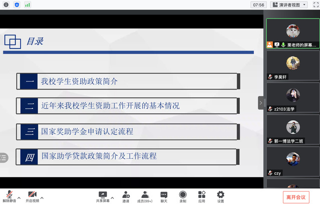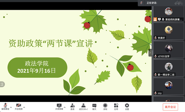 为进一步宣传好国家资助政策,做好新学期学生资助工作,9月16日,政法学院开展了2021级新生资助政策“两节课”线上宣讲活动,活动由负责学生资助专项工作的栗想老师主讲,2021级辅导员及2021级全体新生参加了本次活动。