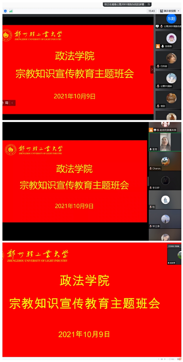 为切实加强中国特色社会主义民族宗教理论、党的民族宗教政策和国家有关法律法规的宣传教育,引导大学生崇尚科学,树立正确的宗教观,政法学院于10月9日开展了宗教知识宣传教育主题班会活动。