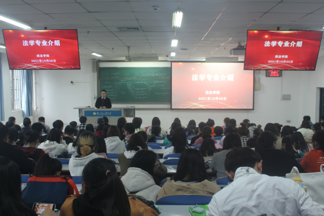 10月20日中午,政法学院法学系在科学校区三教楼102室召开2021级新生专业教育会。政法学院2021级法学专业学生和法学系教师参加会议。