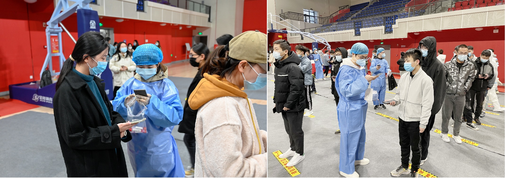 在核酸检测现场,志愿者们协助医护人员做好信息登记、体温检测、秩序维护等工作,不同的区域均有专人负责引导,并不断提醒大家戴好口罩、保持间距。在志愿者们的共同努力下,核酸检测现场秩序井然。前来检测的师生们提前扫码填报个人信息,信息核检人员对照参检人员生成的二维码进行信息核对,医护人员身着防护服采集咽拭子标本。全体参检人员佩戴口罩、保持间距根据不同的时间段依次排队进行检测,最后按照志愿者指引有序离开,在工作人员和志愿者们的共同努力下,科学校区全体师生核酸检测工作顺利完成。