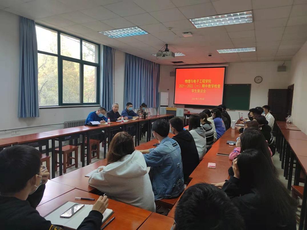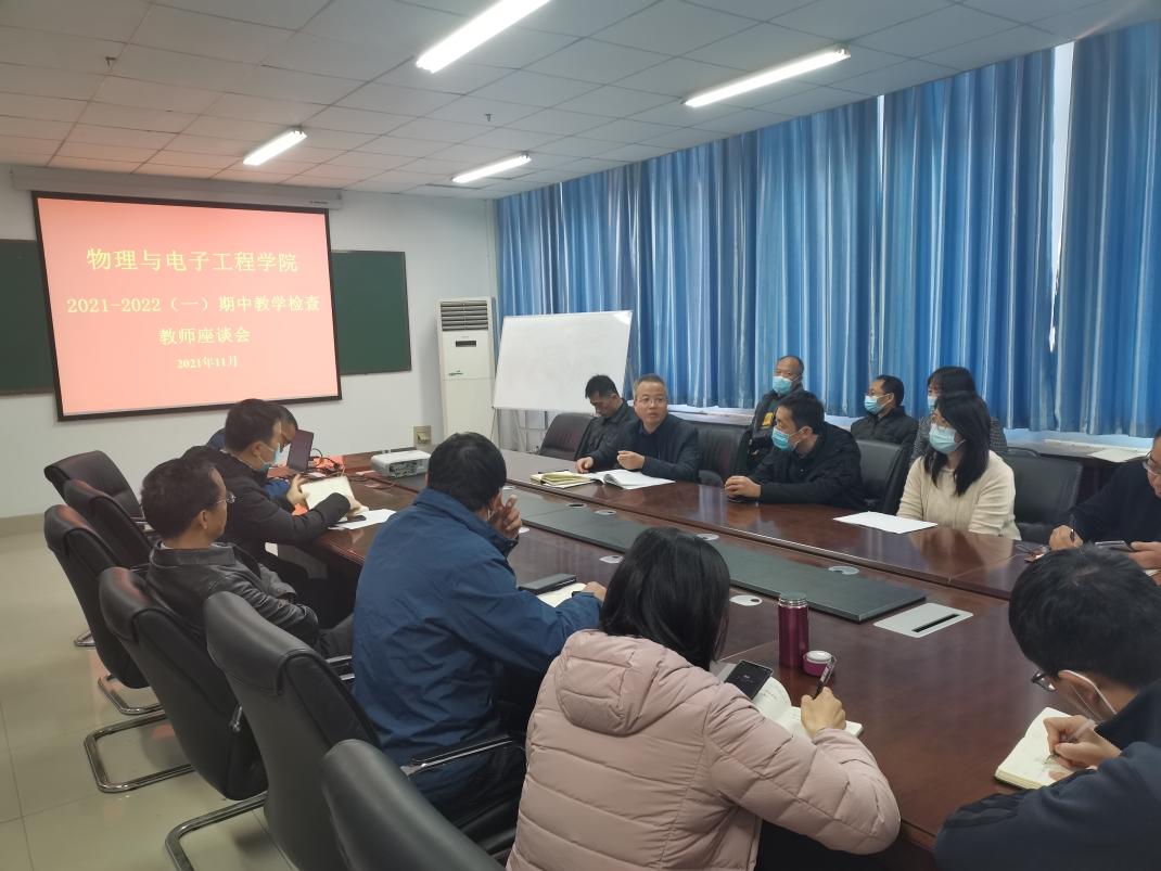 根据学校期中教学检查的要求和学院工作安排,物理与电子工程学院于11月4日和11月11日,分别召开了2021-2022学年第一学期期中教学检查学生座谈会和教师座谈会。各系部主任及教师代表、学院督导组成员参加了座谈会。座谈会由副院长冯学超主持。