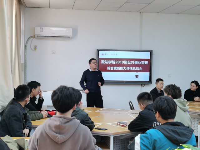 1126日下午,政法学院公共事业管理系在政法楼100举办学生专业综合素质能力训练总结大会。公共事业管理系副主任刘晋博士、张绍阳博士、张家旗博士、冯华超博士以及2019级公共事业管理专业全体同学参加了此次会议,会议由系副主任刘晋主持。