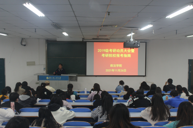 为帮助同学们明确考研目标、坚定考研信心,11月26日中午,政法学院在三教楼109室举办2019级学生考研动员大会暨考研院校报考指南讲座。学院党委书记宋德涛老师、副书记刘放美、2019级全体学生参加了会议。