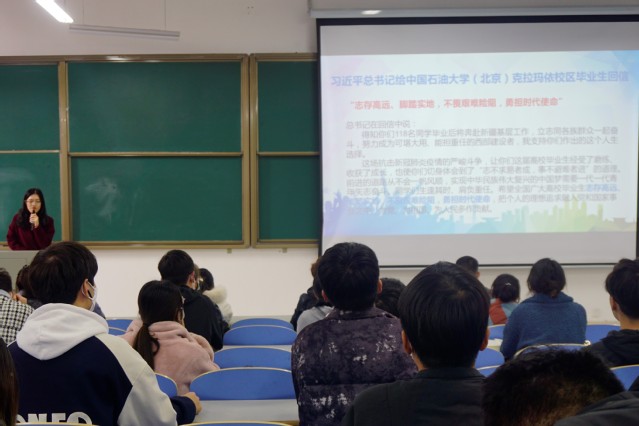 习近平总书记2016年在全国高校思想政治工作会议上指出:“要鼓励高校学生把视线投向国家发展的航程,把汗水洒在艰苦创业的舞台,到基层去、到西部去、到祖国最需要的地方去,做成一番事业、做好一番事业”。活动中,寇誉元结合多年就业创业工作经验,对国内宏观就业形势、学院各专业就业方向和考研情况,以及国家就业创业政策进行了具体讲解,鼓励大家深入认识自我,明确职业规划,树立正确择业观念,从基层岗位做起,服务社会、报效国家。随后,寇誉元结合习近平总书记给中国石油大学(北京)克拉玛依校区毕业生回信、习近平总书记给在首钢医院实习的西藏大学医学院学生回信、习近平总书记给河北保定学院西部支教毕业生群体代表回信精神,从报名时间、报名要求、报名流程、政策支持等方面为大家详细介绍了志愿服务西部计划、大学生应征入伍、“三支一扶”计划、选调生考试等基层就业渠道,号召大家把个人理想追求融入党和国家事业之中,到基层和人民中去建功立业,为党、为祖国、为人民多作贡献。