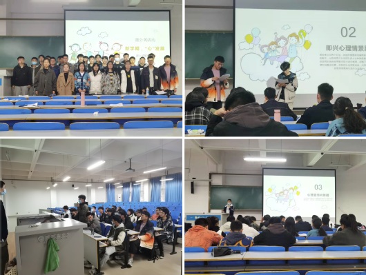 本次活动包含热身、即兴心理情景剧和观看心理宣传片三个环节,在热身环节中,同学们通过游戏互动互相了解,提升了同学们的自信心和协作能力。在即兴心理情景剧环节,全班同学随机分为两个队伍,由主持人提前准备两段心理情景剧的剧本,分别给两个队伍讨论并各自按照剧本即兴进行表演。在讨论过程中,队伍成员们积极共情角色,共同探讨对剧本的理解;在表演环节,同学们们将感情融入其中,发挥自己的聪明才智,用自己的个性诠释角色。最后,主持人组织同学们观看心理健康教育宣传片,更好地帮助同学们了解大学生常见的心理问题及应对方法。