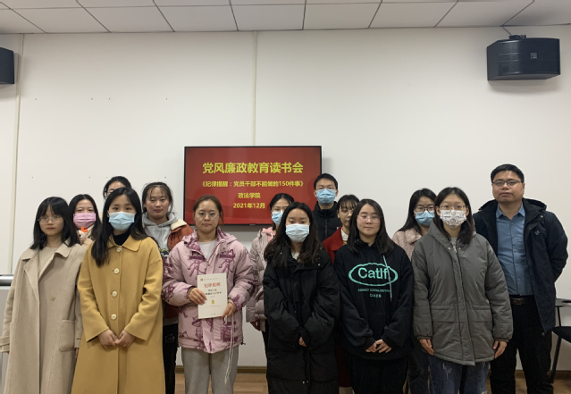 为强化党性党风党纪,加强党风廉政宣传教育,12月14日,政法学院本科生第二党支部在政法楼103室开展党风廉政教育第一期读书会。读书会选读的书目是《纪律提醒:党员干部不能做的150件事》,读书会由学院党委纪检委员郝宏杰主持。