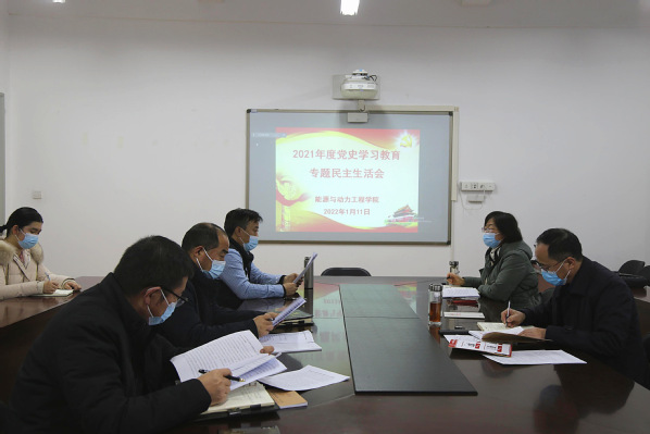 2022年1月11日下午,能源与动力工程学院在工程楼407会议室召开2021年度党史学习教育专题民主生活会,本次会议以线上线下相结合的方式召开,学院全体领导班子成员、组织员参会,会议由学院党委书记邵建敏主持。