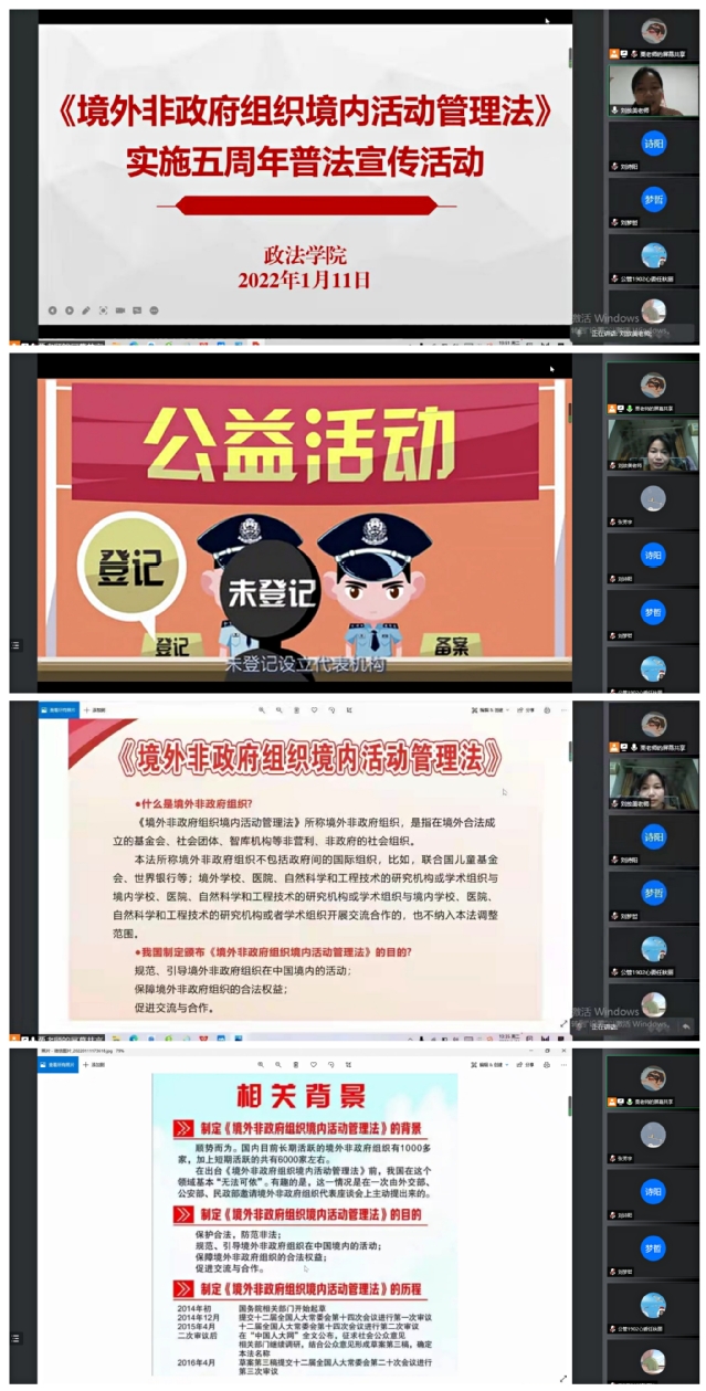为进一步加强普法宣传,增强师生法律意识,强化师生安全防范能力,1月11日,政法学院开展了《中华人民共和国境外非政府组织境内活动管理法》实施五周年普法宣传活动,活动由栗想老师主持,学院党委副书记刘放美、全体专兼职辅导员及各年级同学参加了此次活动。