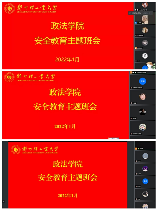 为进一步做好安全教育工作,增强全体学生的安全意识,政法学院于1月30日召开线上安全教育主题班会,各年级辅导员主持会议,全体学生参加。