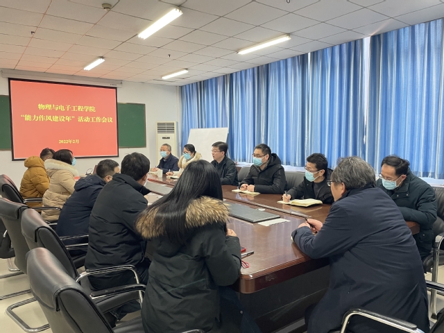 2月19日下午,物理与电子工程学院在四教楼510会议室召开“能力作风建设年”活动工作会议,学院领导班子成员、科级干部、党支部书记参加了会议。会议由学院党委书记赵阳主持。