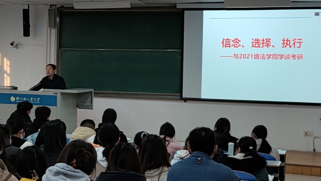 会上,宋德涛书记以2021级专升本招录的生源分析为切入点,以“信念、选择、执行”为主题,从为什么考研、怎么去考研、考研的建议、往年考研情况分析、考研的利好政策五个方面进行讲解,分析了考研与法考的关系,并结合学院专业特色分析了近四年学院考研情况,从考研意向率、报考率、最终考研率等方面,深入分析考研的优势与劣势,详细讲解了在准备考研过程中的注意事项和考研学校专业导师选择、考研资料信息搜集等,对同学们如何选择适合的目标学校进行了专门指导。他希望同学们要树立远大理想,提早做打算、定目标,努力寻求能够施展个人才能的更大空间,为将来成为国家栋梁之才、实现人生梦想而不懈奋斗。