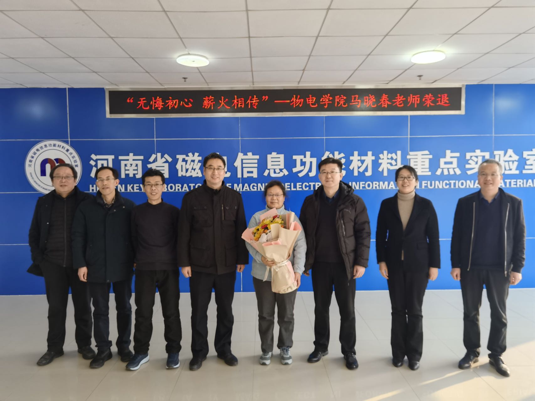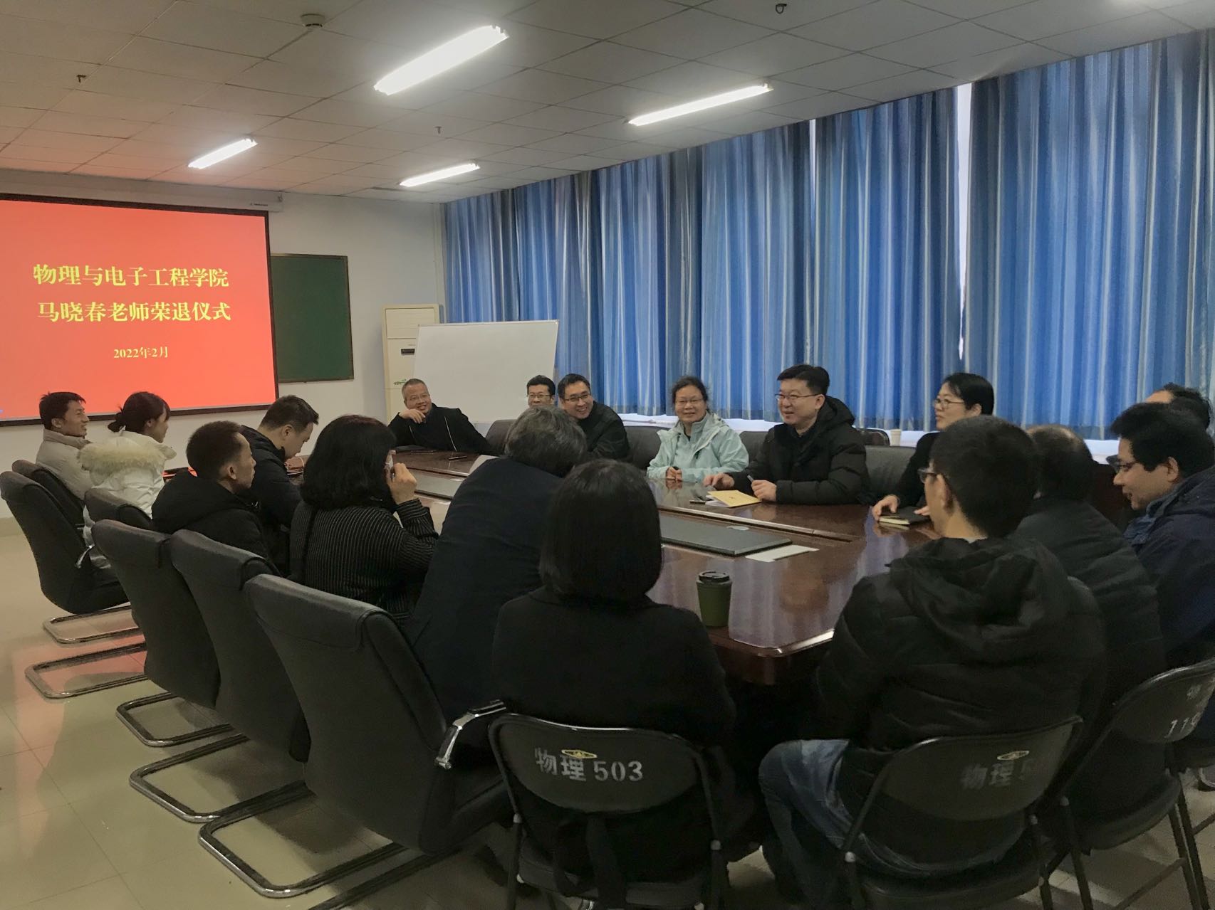 2月24日下午,物理与电子工程学院在四教楼510会议室举行马晓春老师荣誉退休仪式。学院领导班子和教师代表参会,仪式由党委书记赵阳主持。