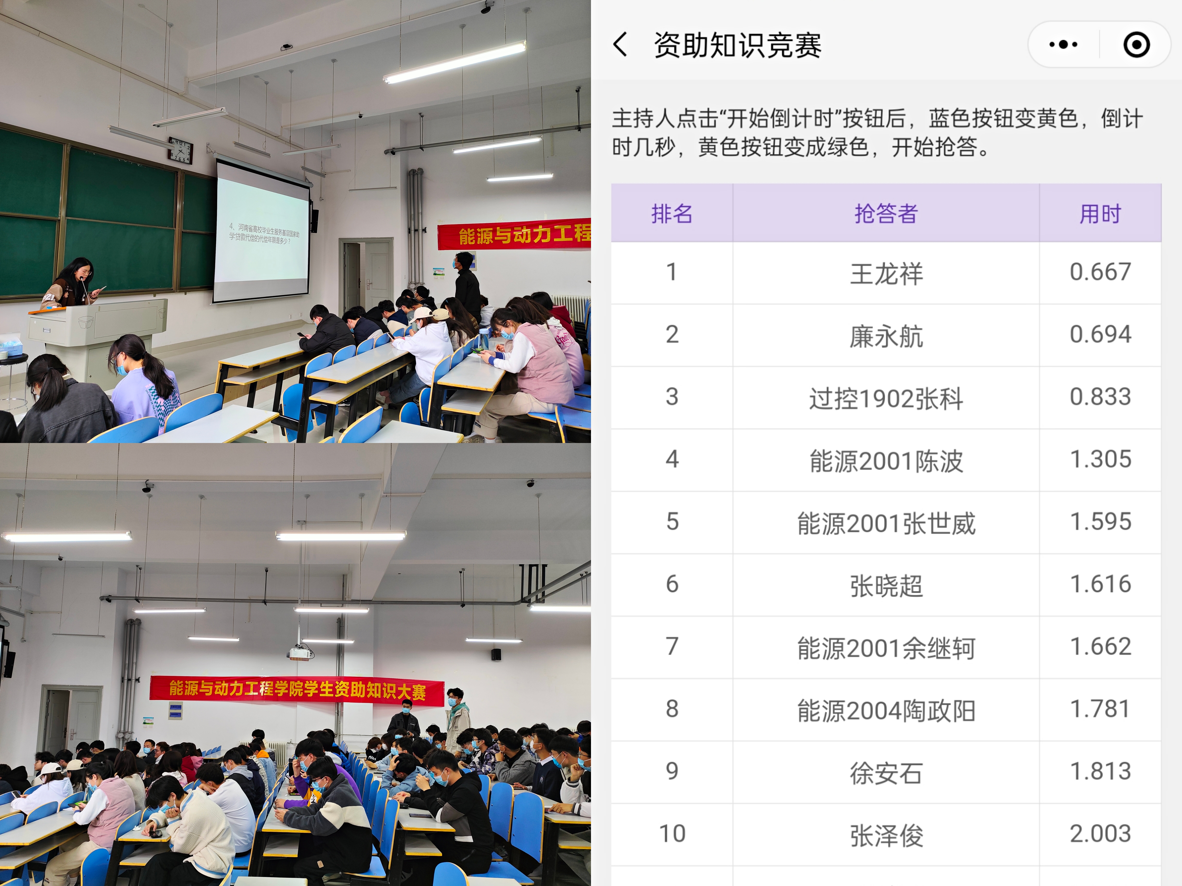 此次大赛采用抢答方式进行,参赛同学通过微信小程序进行抢答。题目分为单选题、多选题和简答题三个类型。根据累计得分评出一、二、三等奖。经过激烈的抢答,叶金璐、廉永航同学荣获一等奖,王龙祥、聂赟翔、高歌、郭旭祥同学荣获二等奖,殷秀兵、陈壮、王晨、许文杰、张乐凯、邵鹏飞等六位同学荣获三等奖。