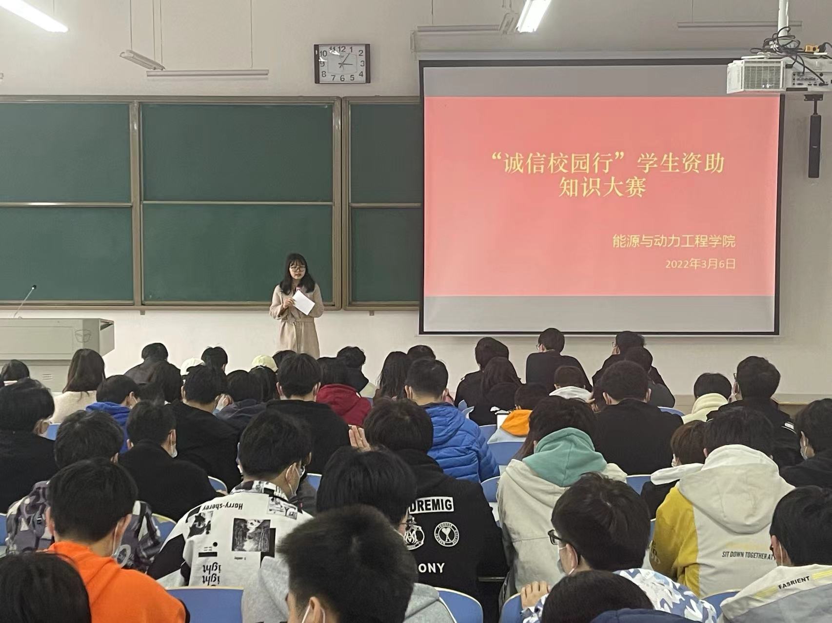 为积极宣传国家资助政策,提高学生诚信感恩意识,3月6日下午,能源与动力工程学院在工程楼109室举办了“诚信校园行”学生资助知识大赛,各年级推选代表参与此次大赛,大赛由谢梦情同学主持。