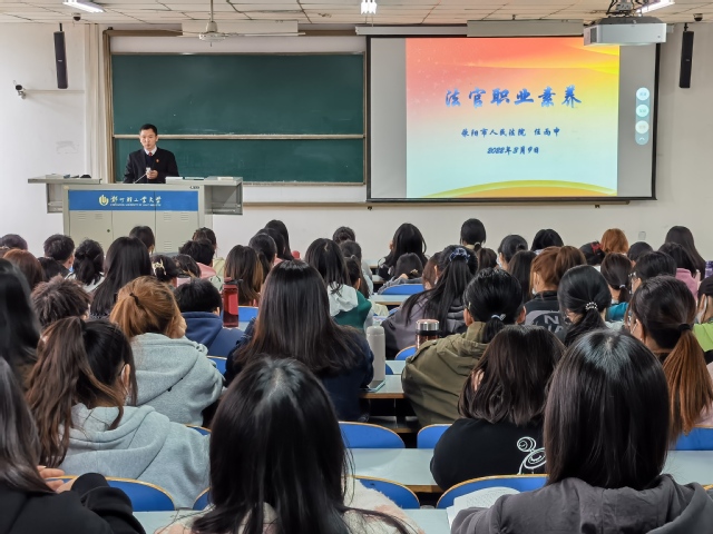 任丙申法官从事民商事审判26年,现担任荥阳市人民法院审判委员会委员、民事审判庭庭长,曾荣立个人二等功1次、个人三等功5次,并先后荣获河南法院系统先进个人”“平安郑州杰出法治人物”“绿城卫士”“郑州基层法院十大优秀法官”“爱岗敬业标兵”“办案能手等多个荣誉称号,具有丰富的理论和实践经验。在讲座中,任丙申法官结合多年审判经验,讲授了法官的职业准入制度、法官职业行为规范、法官行为监督和奖惩机制等内容。任丙申法官的讲座内容详实,既有理论深度,又有大量的具体实践经验,赢得了同学们的一致好评。讲座结束之后,同学们就相关问题踊跃提问,任丙申法官又耐心细致地做了解答。