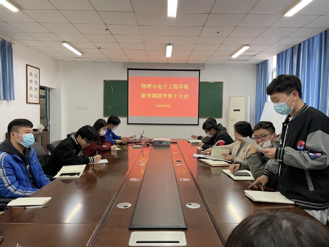 3月4日中午,物理与电子工程学院在四教楼510会议室召开新学期团学骨干大会,学院团委书记周芳华及全体团学骨干参加了此次会议。