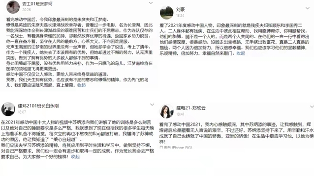 此外,我院还组织学生在社交平台上发表自己对于“感动中国2021年度人物”事迹的学习体会,同学们踊跃参加,营造出了学习先进、效仿先进的良好氛围。
