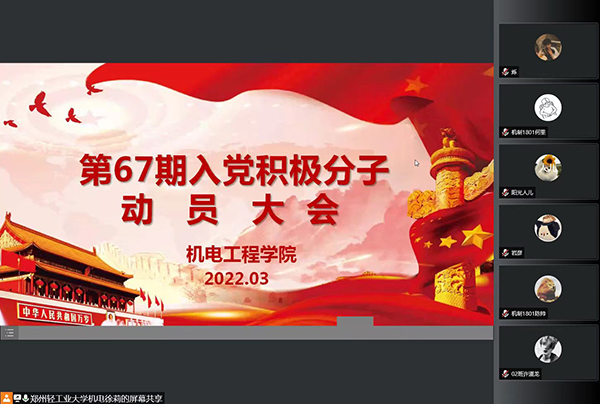 2022年3月24日中午,机电工程学院在线上召开了第67期入党积极分子培训动员大会。科级组织员徐莉老师和我院参加本期入党积极分子培训班学生参加了此次动员会。