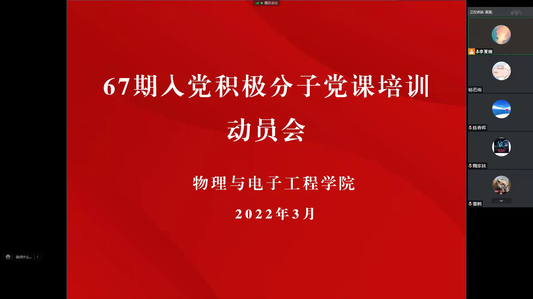 为了强化入党积极分子教育,增强入党积极分子的党性修养,加强学生党支部队伍建设,3月24日下午,物理与电子工程学院在线上召开了第67期入党积极分子党课培训动员大会。负责党务工作的李夏楠老师、学院79名党课培训班学员参加了会议。