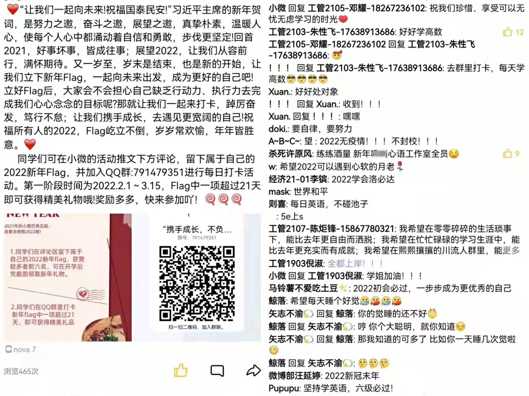 为建设优良学风,培养良好的学习生活习惯,丰富同学们的课余生活,引导大家学习脚踏实地、坚持不懈的良好品质,展现经管学子积极向上、朝气蓬勃的青春风采,2022年2月19日至3月,经济与管理学院Find Me心语相伴辅导员工作室组织开展“携手成长,不负韶华”之Flag线上活动,学院近千名学生参与了本次线上打卡活动。
