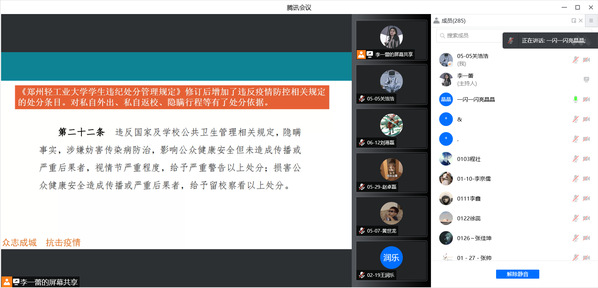 按照省委省政府、省教育厅及属地疫情防控指挥部部署安排,为进一步落实疫情防控相关要求,增强学生疫情防控意识,毫不松懈做好学院疫情防控工作,计算机与通信工程学院全体专兼职辅导员组织各班召开“增强疫情防控意识、遵守疫情防控要求、争做疫情防控模范”线上主题班会。