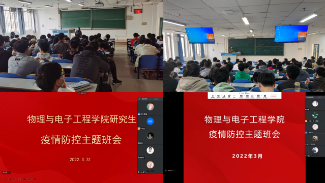 3月31日,物理与电子工程学院各年级辅导员通过线下课堂走访与线上网络会议相结合的方式,面向全体学生召开了疫情防控主题班会。