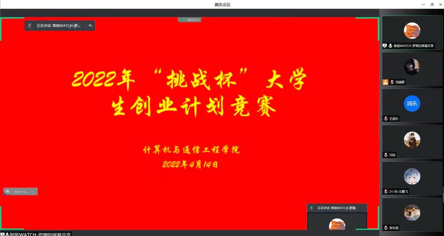 为培养大学生科技创新兴趣,提高学子动手实践能力,遴选优秀项目作品,2022年4月14日,计算机与通信工程学院举办2022年“挑战杯”大学生创业计划竞赛院级初赛。计算机学院专业教师代表作为评审专家出席大赛并担任评委,比赛通过线上会议的方式分三个会场举办。