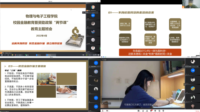 多措并举,精准发力。各年级辅导员通过开展线上金融安全知识暨资助政策“两节课”主题班会,重点介绍了不良校园贷的形式与危害、非法网络诈骗的典型案例、个人征信的重要性,播放了金融安全知识宣传教育片,增强学生对金融安全的理解和认识,引导学生养成文明、健康的消费习惯。