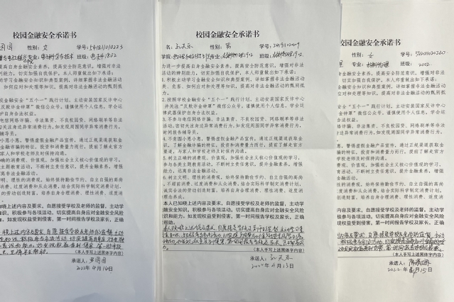 学院四级、五级网格长深入宿舍,组织学生签订《校园金融安全承诺书》,宣传国家反诈中心 APP和“反欺诈金钟罩”微信公众号,确保做到全覆盖、无遗漏。
