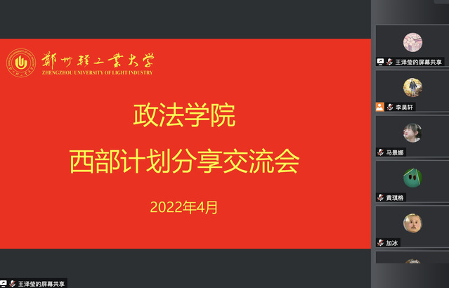 4月17日晚上,政法学院举办西部计划分享交流会,会议邀请政法学院2021年参加西部计划的志愿者刘逸聪、程茜雅两位校友在线分享服务祖国西部的亲身感悟和收获,学院党委副书记刘放美老师和有意向报名志愿服务西部计划的学生参加了会议,会议由就业专职老师李昊轩主持。