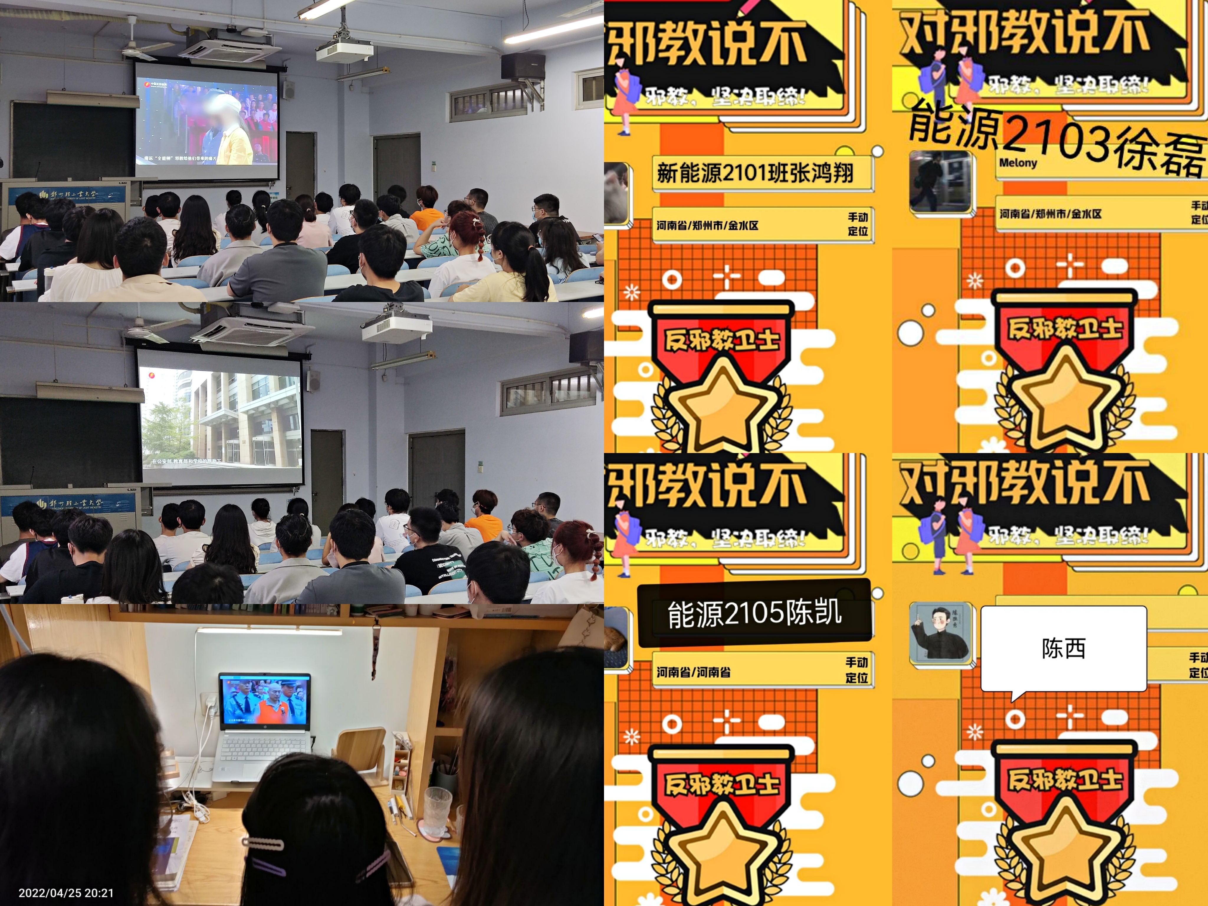 为增强学生防范抵御邪教的意识和能力,4月27日,能源与动力工程学院辅导员组织各班级学生登录中国反邪教网或中国大学生在线“反邪教警示教育进校园”专题,观看警示教育宣传片。