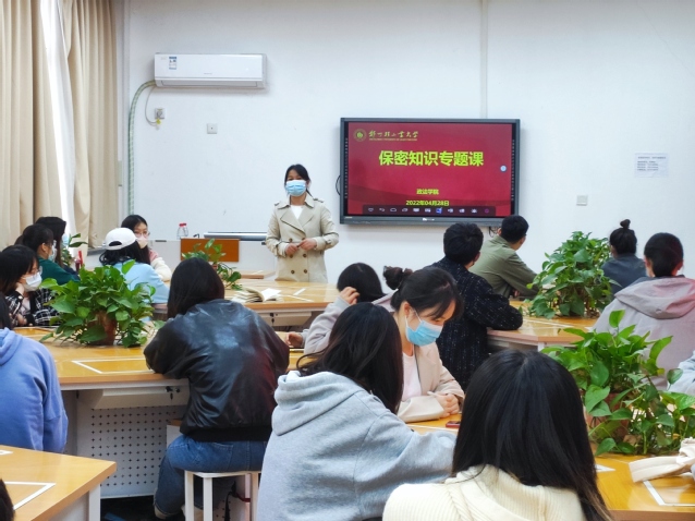 4月29日,政法学院在政法楼100室组织讲授“树牢总体国家安全观,感悟新时代国家安全成就”保密专题课,学院党委副书记刘放美主讲,学院组织员匡竞和本学期学生党员发展对象参加。