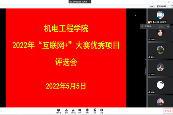 为进一步培养学生创新创业意识,提高参赛项目质量,5月5日,机电工程学院通过腾讯会议举办2022年“互联网+”大学生创新创业大赛优秀项目线上评审会,机电工程学院副院长何文斌、党委副书记孙琳、车辆工程系主任侯俊剑等老师担任评委,学院100余名参赛选手参加了会议。会议由学院就业专职教师吕志斌主持。