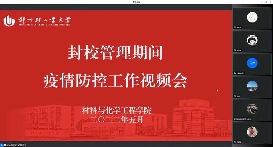 5月6日晚,材料与化学工程学院召开封校管理期间疫情防控工作视频会,学院党委书记常亮、院长周立明,副院长杨许召、全体专兼职辅导员参与会议,会议由学院党委副书记司丽娜主持。