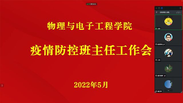 5月12日中午,物理与电子工程学院召开疫情防控班主任工作会,学院党委书记赵阳、院长杨坤、党委副书记李玲,全体辅导员和班主任参加了会议。