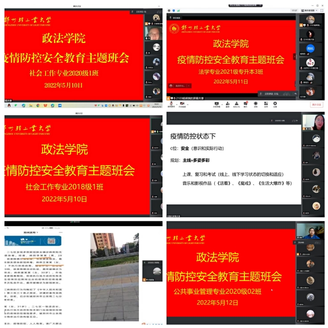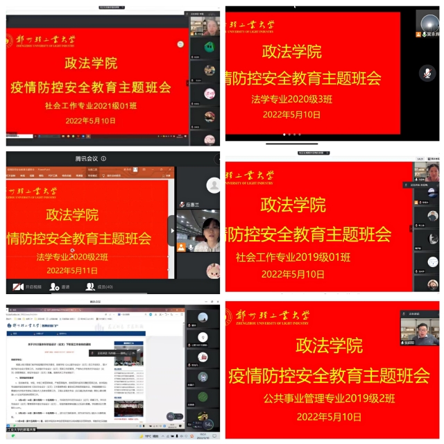 为进一步做好疫情防控期间学生管理和线上教学工作,5月10日-12日,政法学院全体班主任分班级召开了疫情防控安全教育主题班会。
